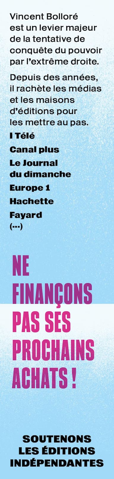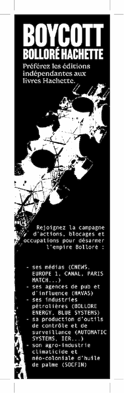 En décembre dernier, dans le cadre de la campagne pour désarmer l'empire Bolloré, des centaines de milliers de marque-pages ont été diffusé à l'intérieur des livres des maisons d'éditions Hachette. Ils pointaient les dangers que représente l'empire Bolloré. Ils dénonçaient sa croisade pour mettre l'extrême-droite et ses idées au pouvoir. Ils appelaient à soutenir les maisons d'éditions indépendantes plutôt qu'à acheter Hachette. Cette campagne de diffusion de marque-pages faisait suite à un tribune d'une centaine de librairies appelant à "escamoter" les livres Hachette de leurs étalages. Pour vous donner une idée et si vous n'êtes pas encore tombé dessus au creux d'un livre, la première série de marque-pages et son mode d'emploi est visible ici